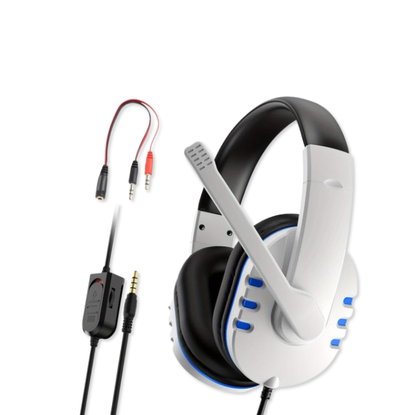 The headset includes a built-in adjustable microphone for clear communication during online gameplay, along with soft cushioned earcups and an adjustable headband for long gaming sessions. It is designed for plug-and-play use with PlayStation consoles, PCs, and other devices with a 3.5mm audio jack.
